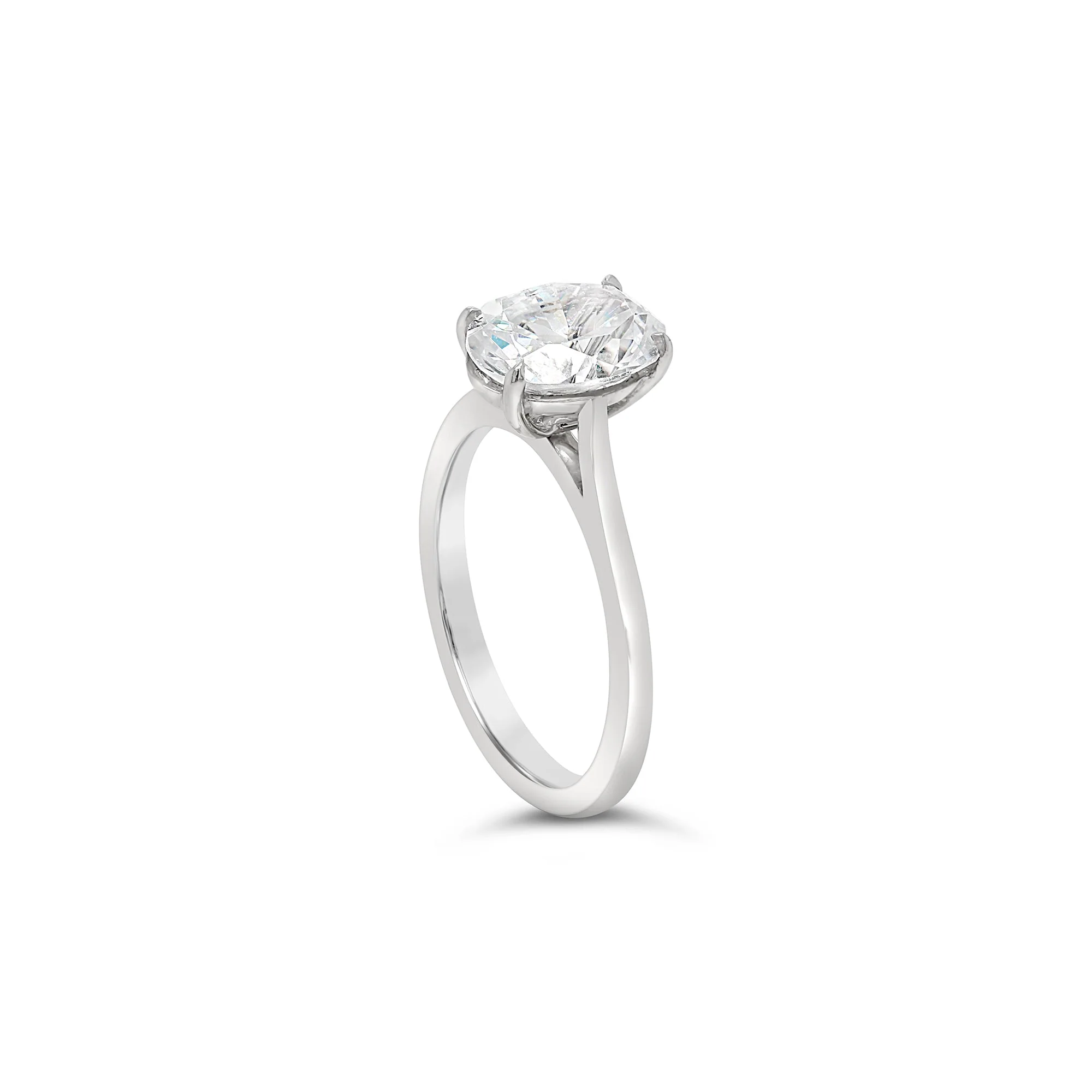 A classic solitaire engagement ring featuring a four claw set oval cut diamond elegantly mounted on a precious metal band.