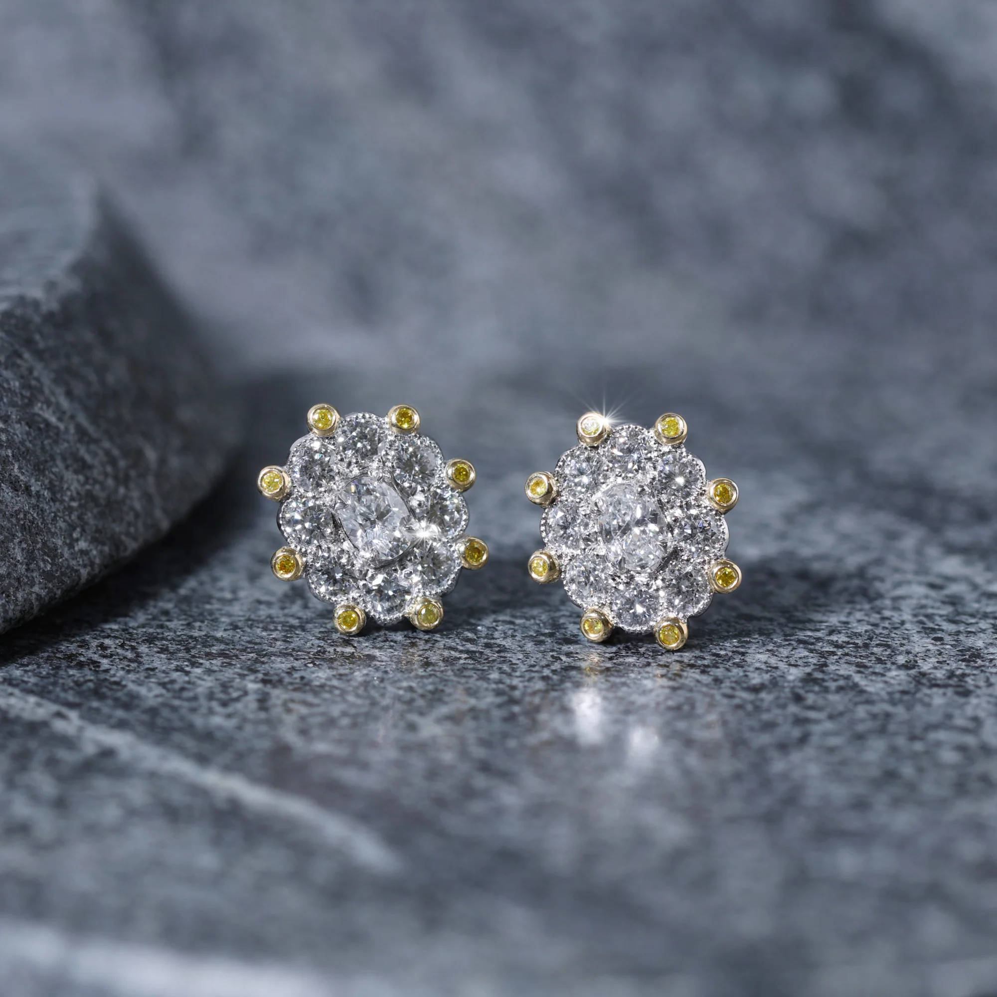 The Blaze collection is inspired by the flames of love. These Fairfax & Roberts designed earrings feature a hand-made four-claw set oval diamond surrounded by a halo of round brilliant cut white diamonds and an outer semi-halo of bezel-set yellow diamonds, complete with milgrain detailing. Crafted from 18ct yellow and white gold.