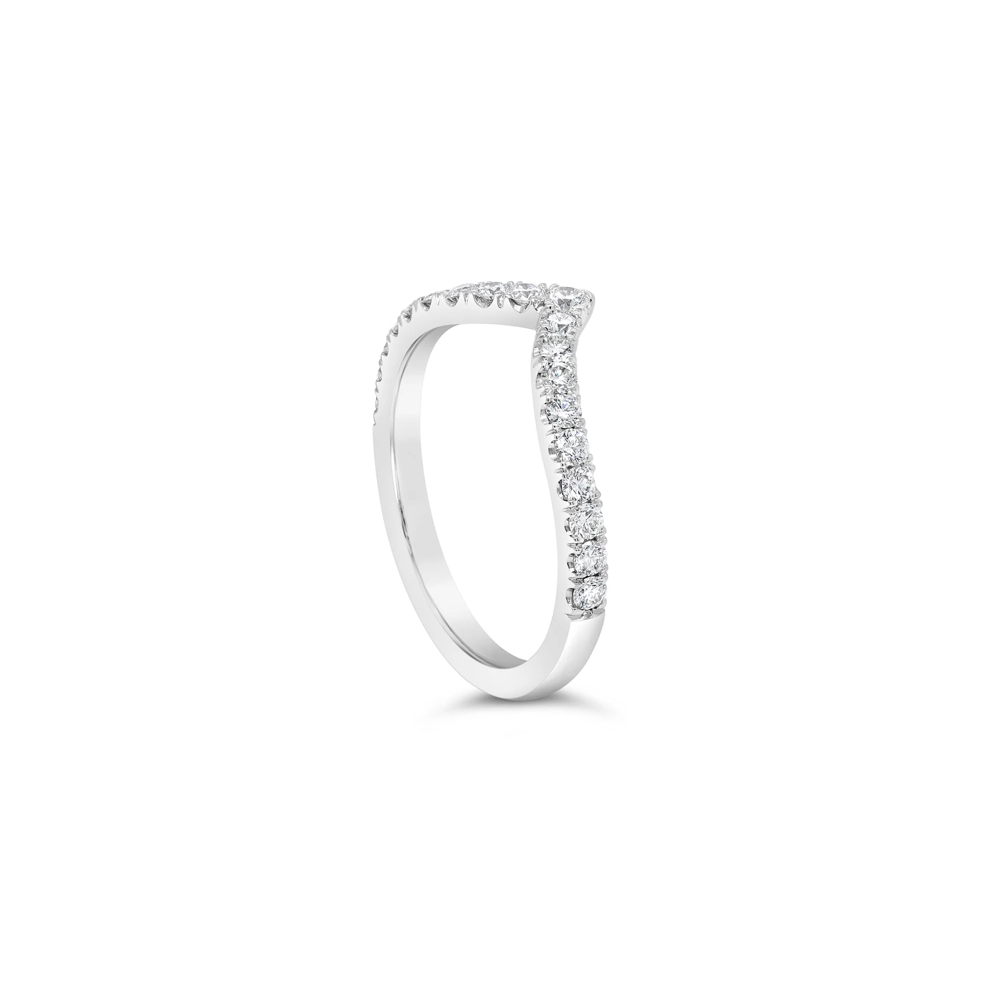A unique, V-shaped ring that is both timeless and modern featuring round brilliant cut diamonds castle set in an 18ct white gold band.