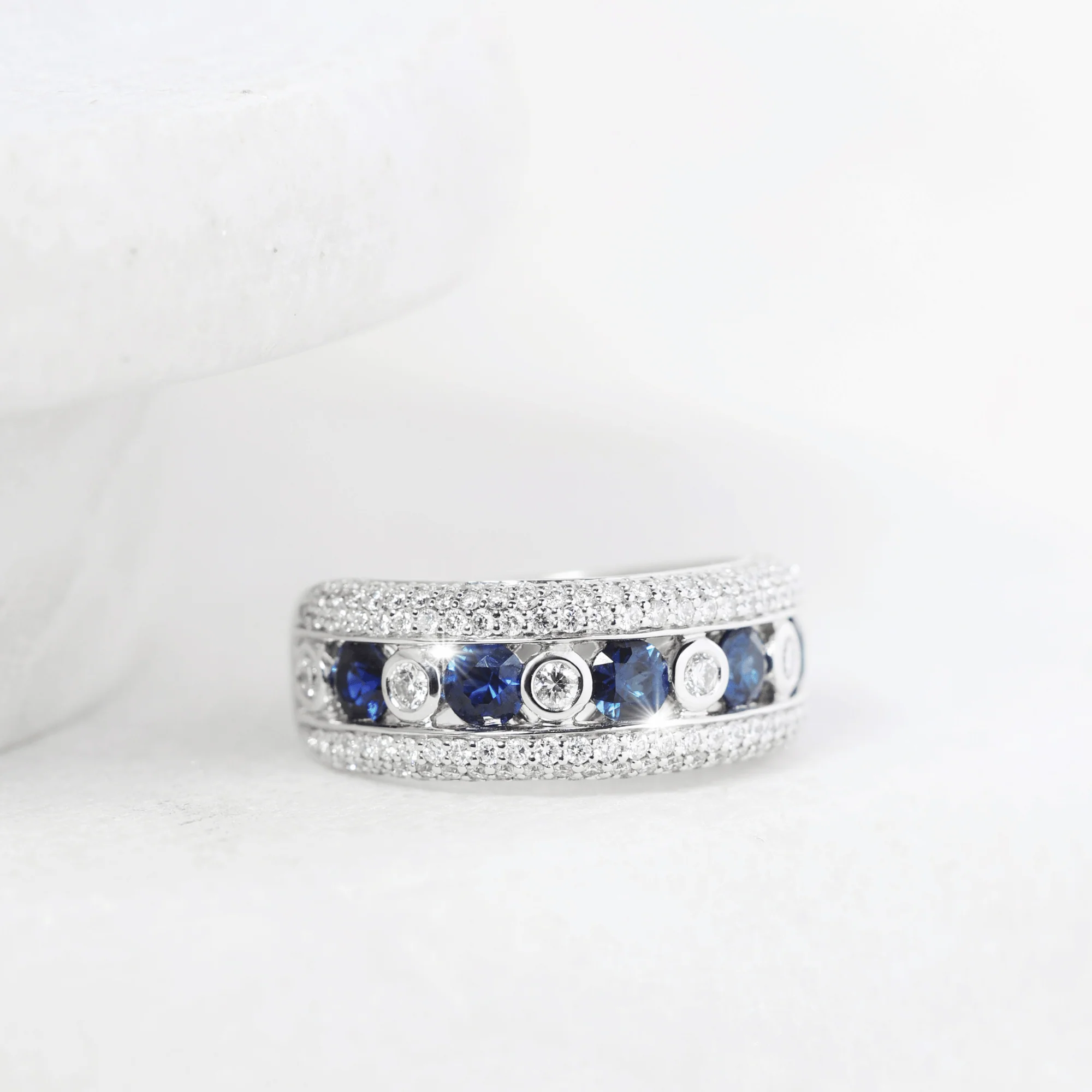 A stunning Ceylon sapphire and diamond dress ring. Featuring alternating round brilliant cut diamonds and sapphires surrounded by pavé-set diamonds.