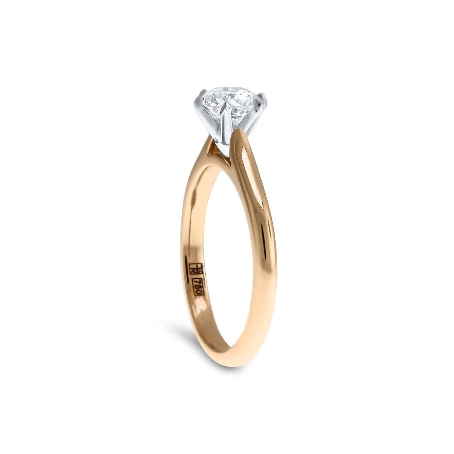 A classic solitaire engagement ring featuring a round brilliant cut diamond supported in a two-tone precious metal setting and knife edge band.