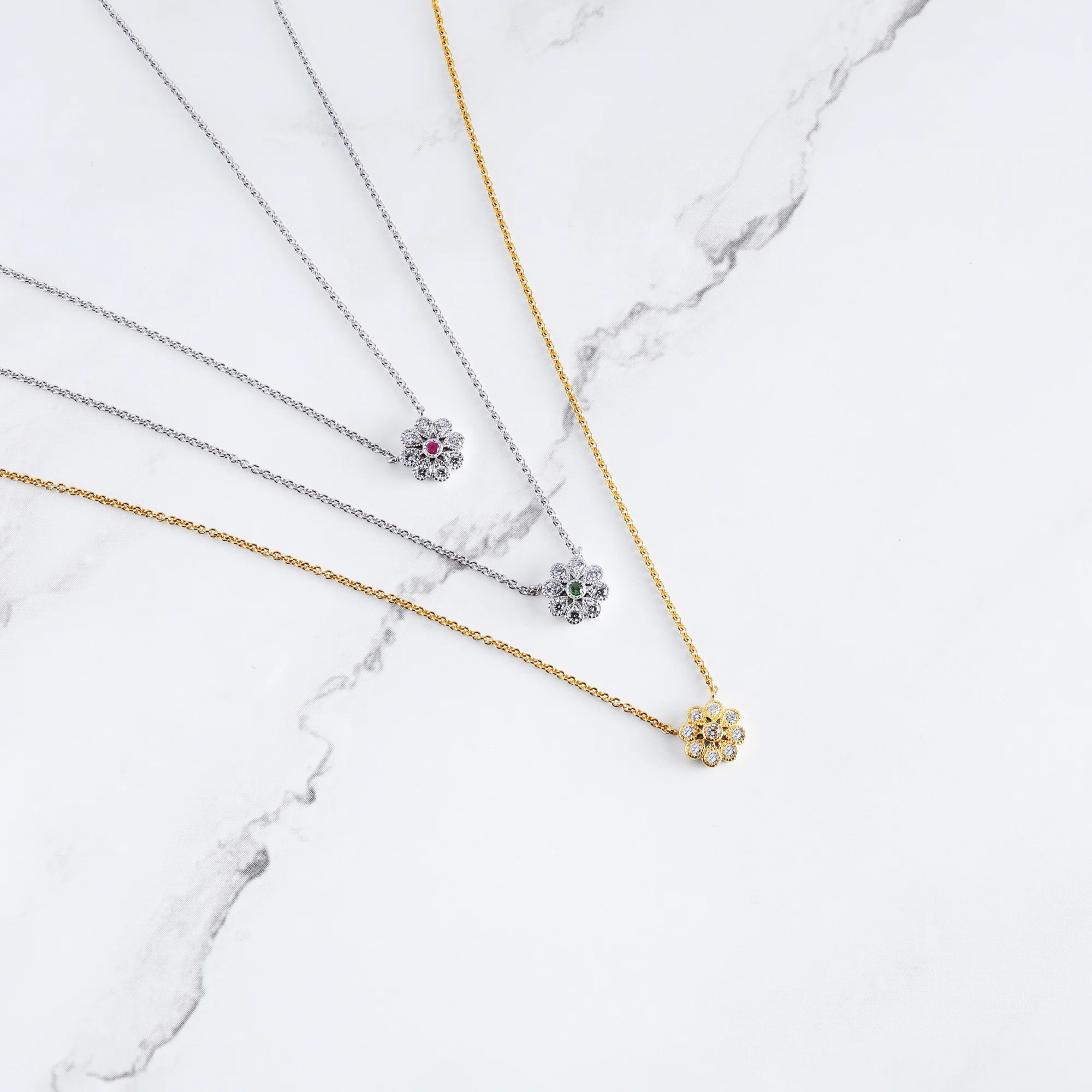 Crafted by the Fairfax & Roberts in-house artisans, this Diamond Daisy Pendant & Chain features a petite floral motif encrusted with hand-set diamonds and a tsavorite garnet adding an element of luxury to a simple and wearable piece.