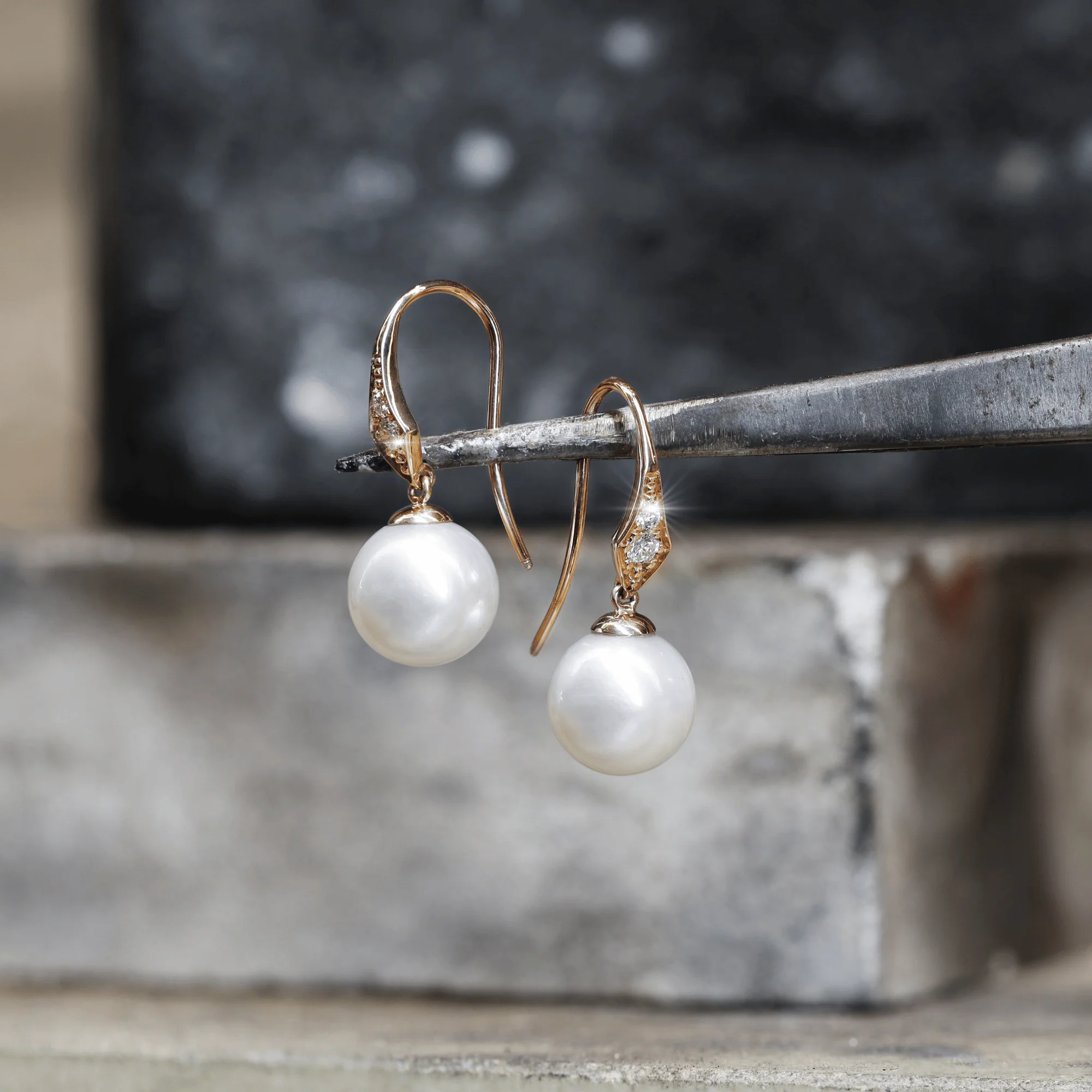 A timeless pair of diamond and Australian South Sea Pearl earrings suspended from a shepherds hook crafted in 18ct yellow gold.