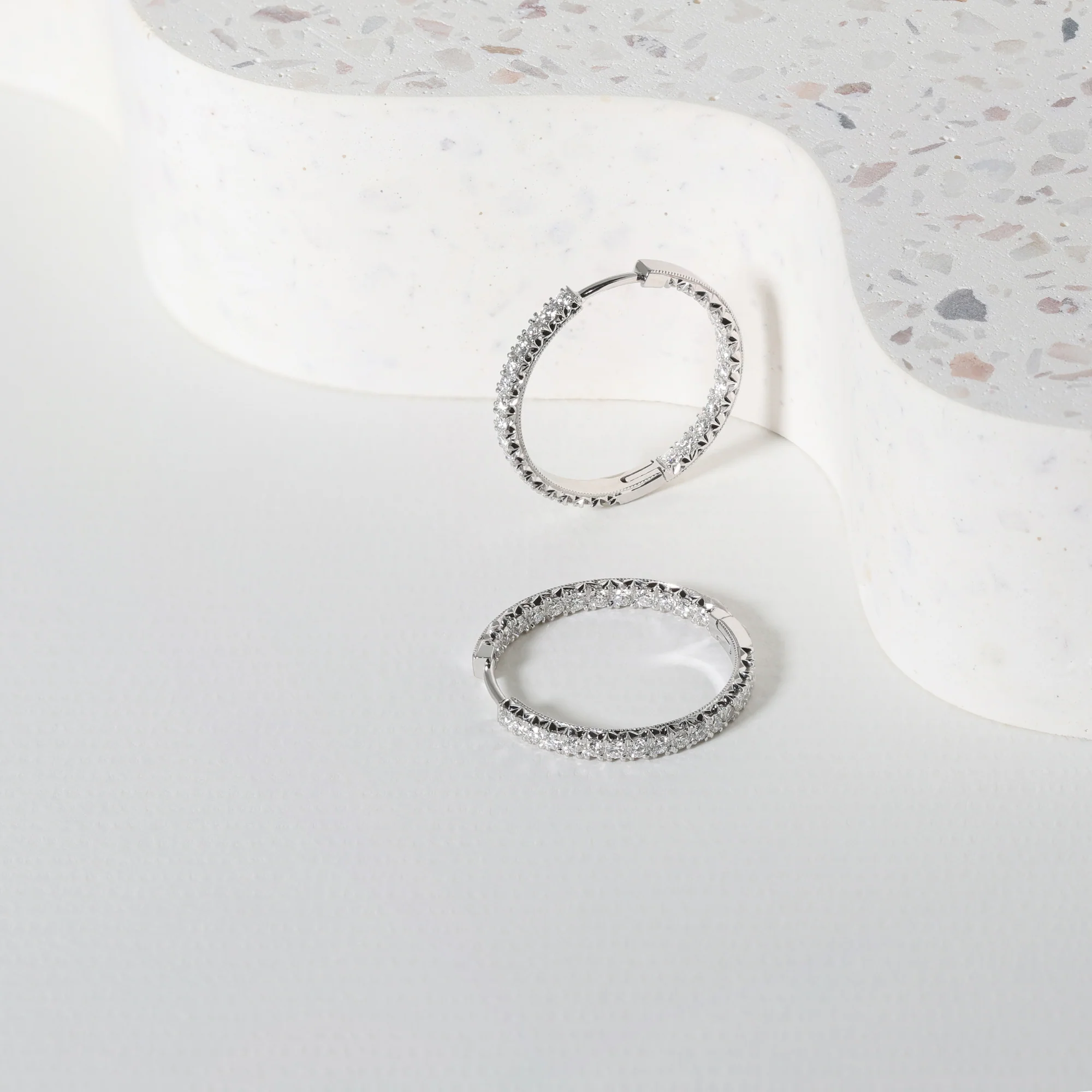 Exclusive to Fairfax & Roberts, these hinged hoop earrings feature an intricate dovetail setting of round brilliant diamonds hand-cut by our master diamond setter. Crafted in 18ct white gold.