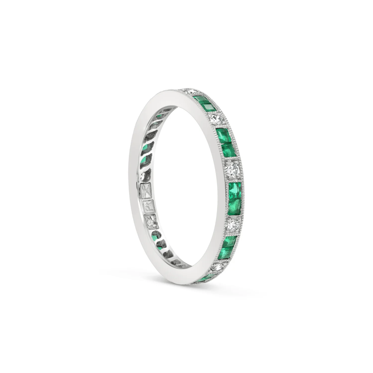 Emerald and diamond wedding or eternity ring with French scissor cut emeralds and carré cut diamonds, hand engraved and fine millgrain detailing throughout. Available in platinum, 18K white, yellow or rose gold.