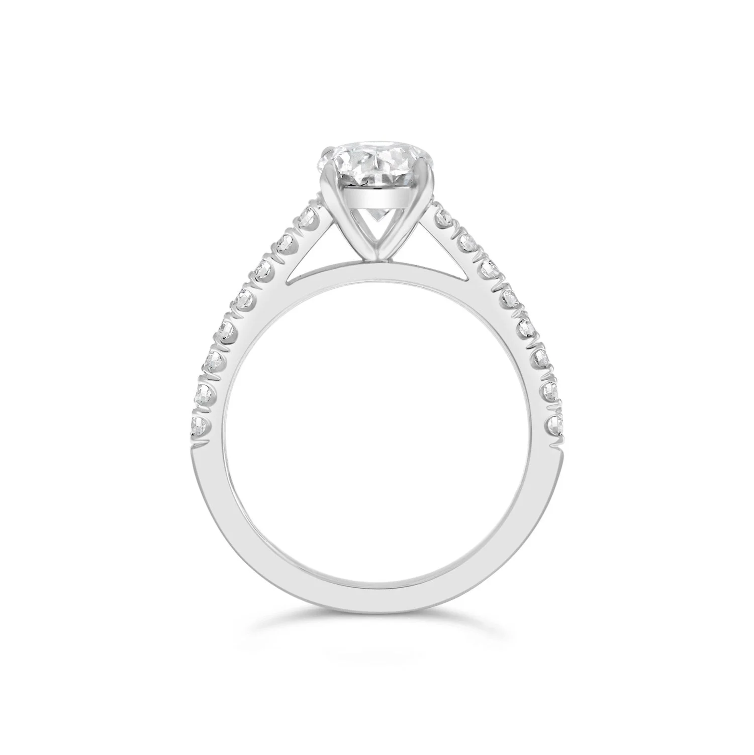 A timeless oval cut diamond engagement ring featuring a hero gemstone mounted on a round brilliant cut, castle set diamond band.