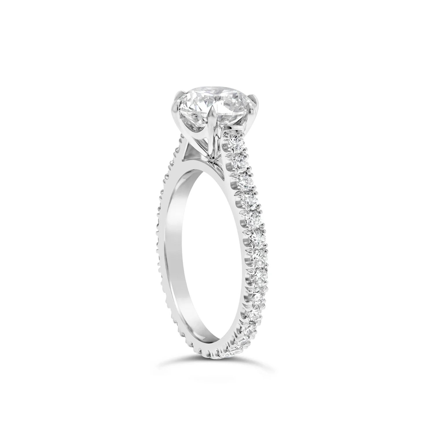 A timeless round brilliant cut diamond engagement ring with a sculpted six claw setting elegantly mounted on an upswept round brilliant cut, castle set diamond band.