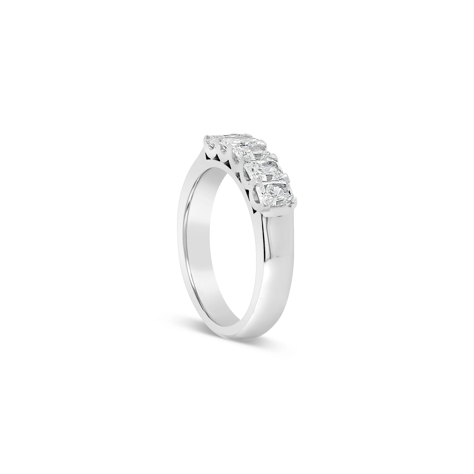 A striking eternity ring featuring five sparkling radiant-cut diamonds set in an 18ct white gold band.