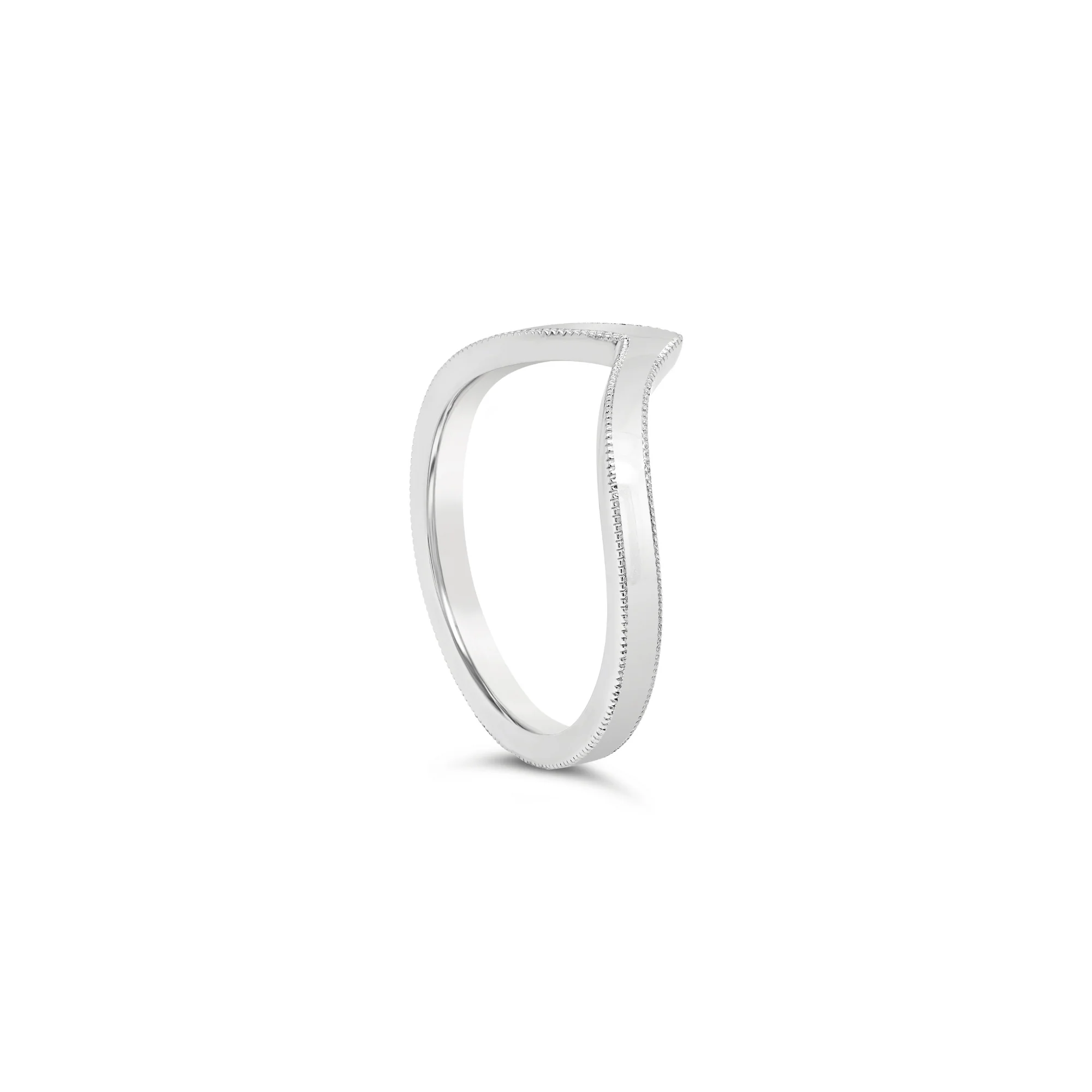 A unique, V-shaped ring crafted in 18ct white gold by our in-house workshop featuring rounded edges and a polished surface complete with milgrain detailing.
