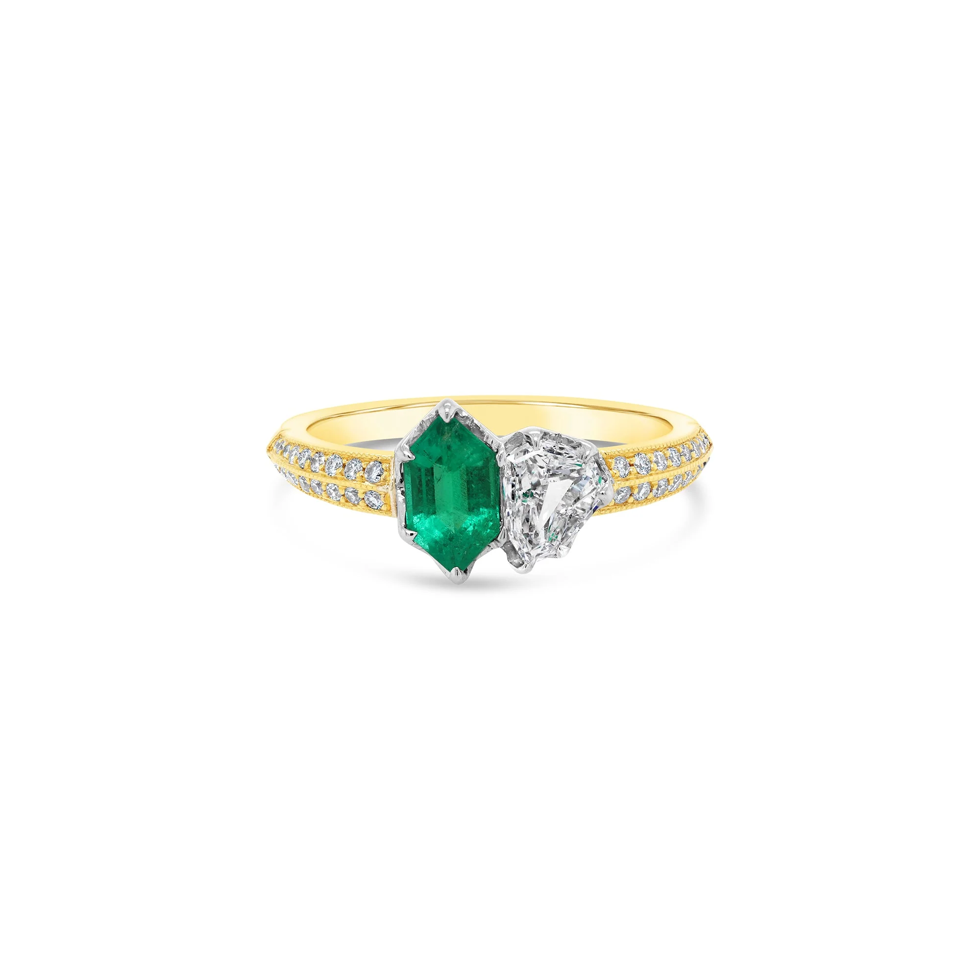 Muzo emeralds from the Colombia Andes region are respected and desired for their vibrant and intense depth of colour saturation and untreated status. This stunning dress ring features a Lozenge shape Colombian Muzo emerald and fancy cut shield-shaped diamond mounted on round brilliant cut diamond yellow gold band.