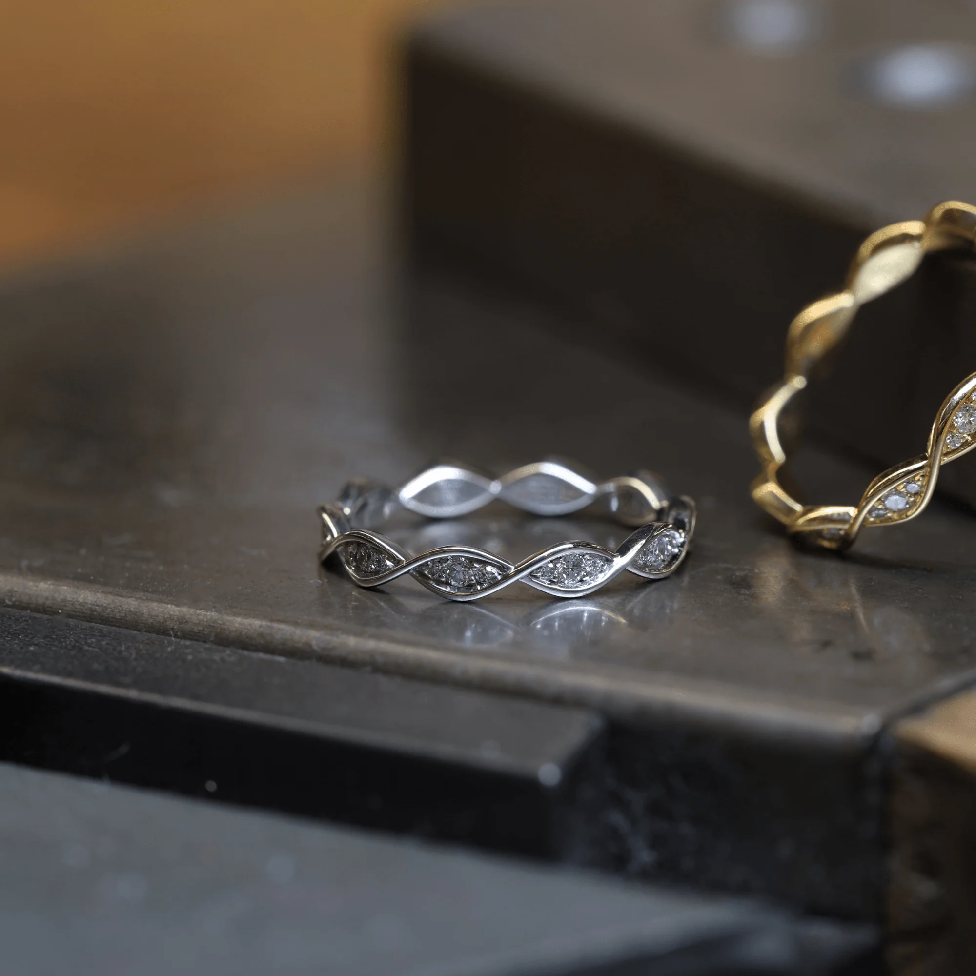 Crafted from 18ct white gold, this ring features a stunning twist design that curves gracefully around the finger. Round brilliant cut diamonds are set within each twist.