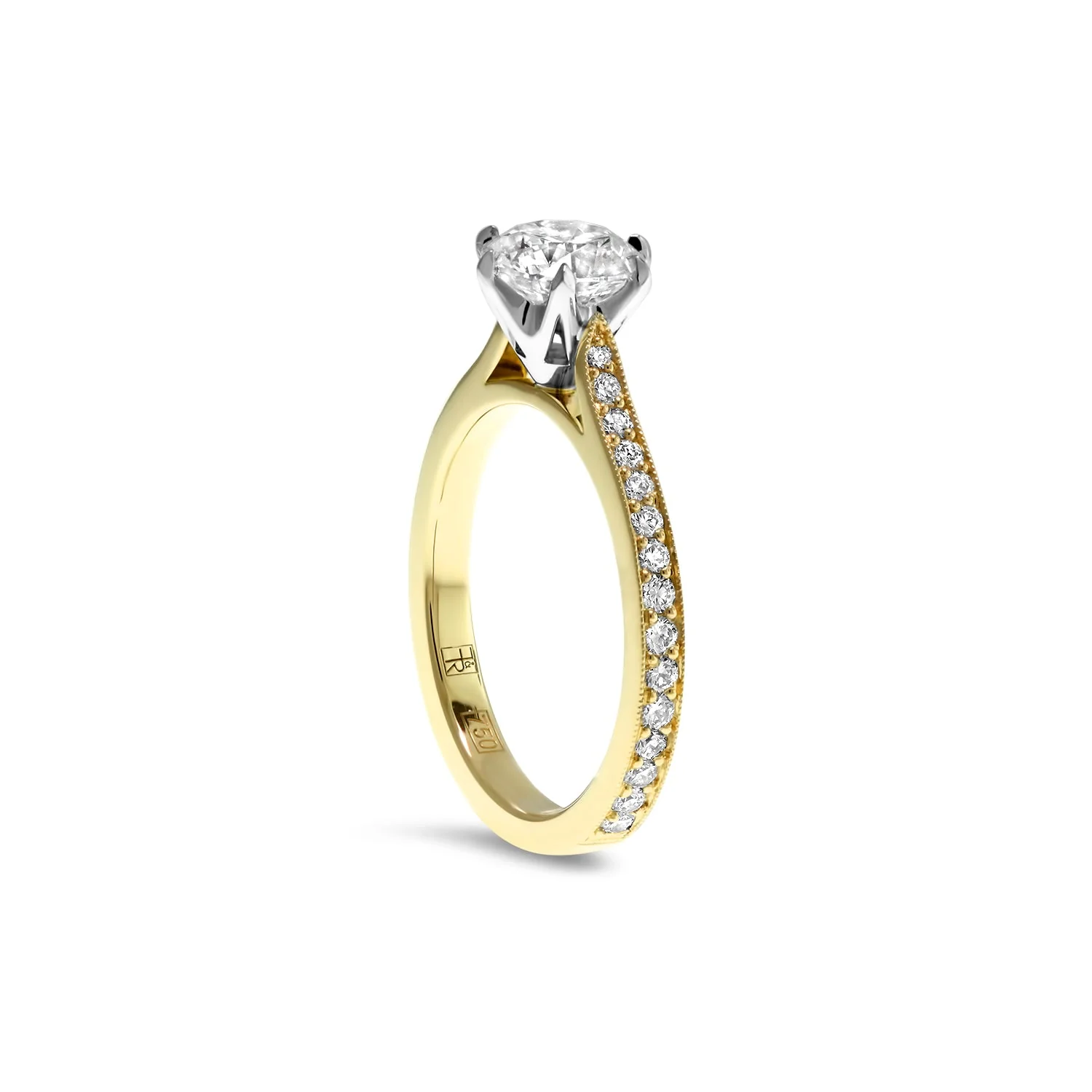 An elegant engagement ring style featuring a six claw round brilliant cut diamond mounted on an upswept, thread set diamond band crafted from two-tones of precious metals.