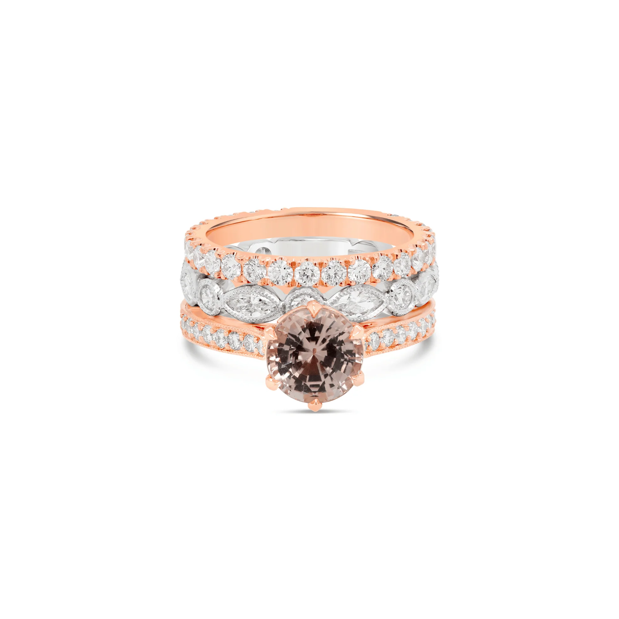 A 2ct round brilliant cut unheated Padparadscha sapphire and thread set diamond engagement ring featuring an up-swept band style complete with milgrain detailing. Crafted in 18ct rose gold.