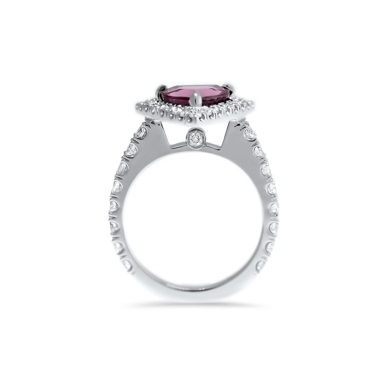 Trilliant cut spinel ring featuring a 1.19ct purple trilliant cut spinel, framed by 0.41ct of round brilliant cut diamonds. Crafted in 18ct white gold.