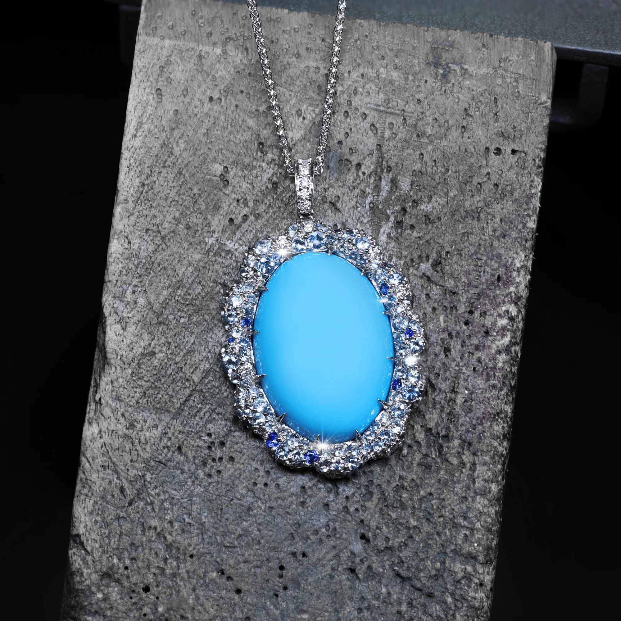 Centered around a striking oval cut turquoise gemstone, this piece radiates tranquility and charm. The gemstone is framed by a scalloped setting adorned with aquamarine, blue sapphire, and diamonds. The pendant suspends from a diamond-set bail and intricately woven diamond-cut foxtail chain. Crafted in 18ct white gold.